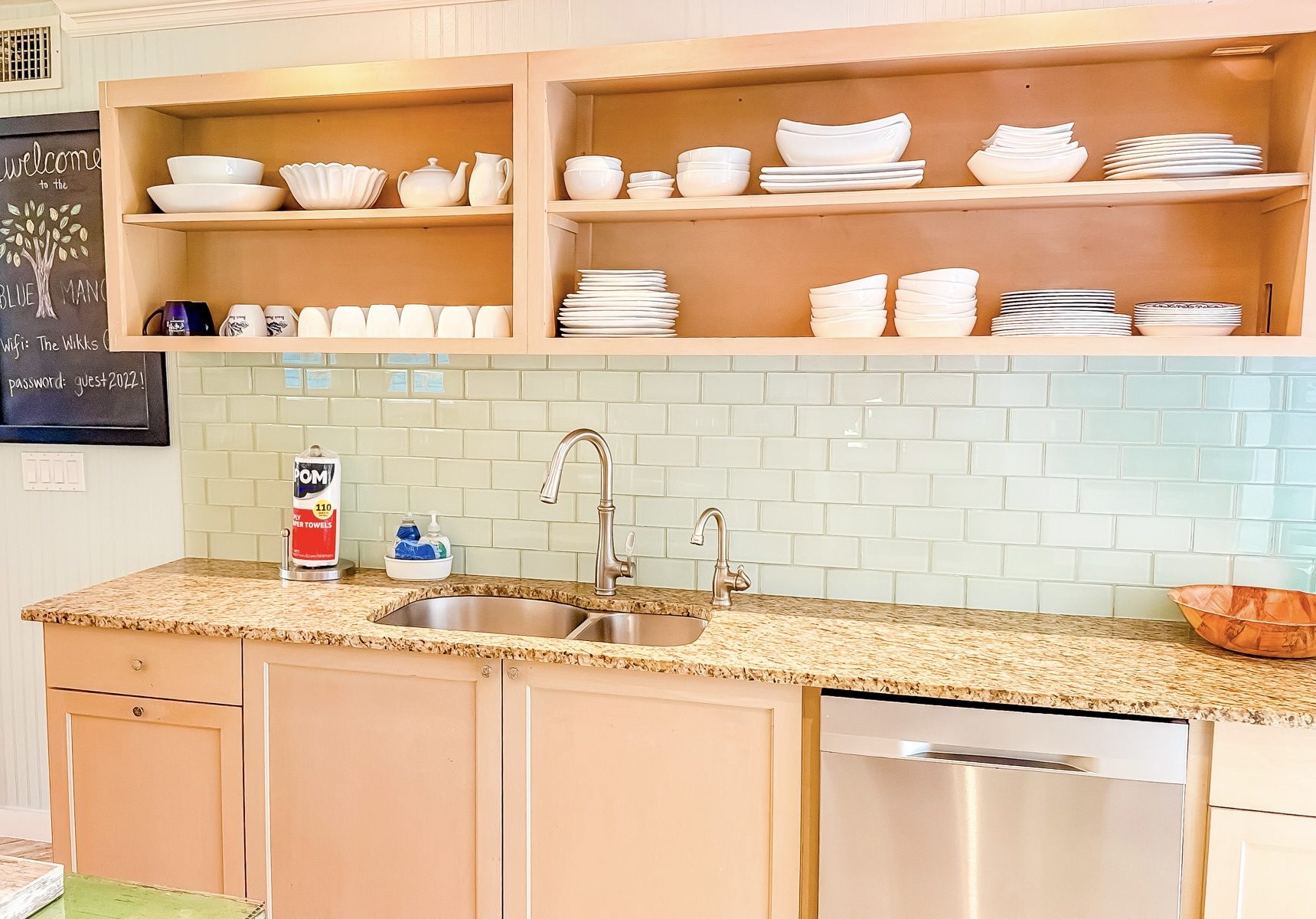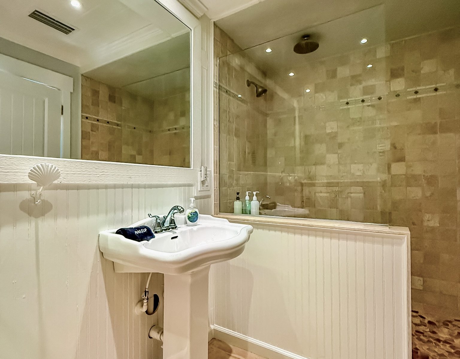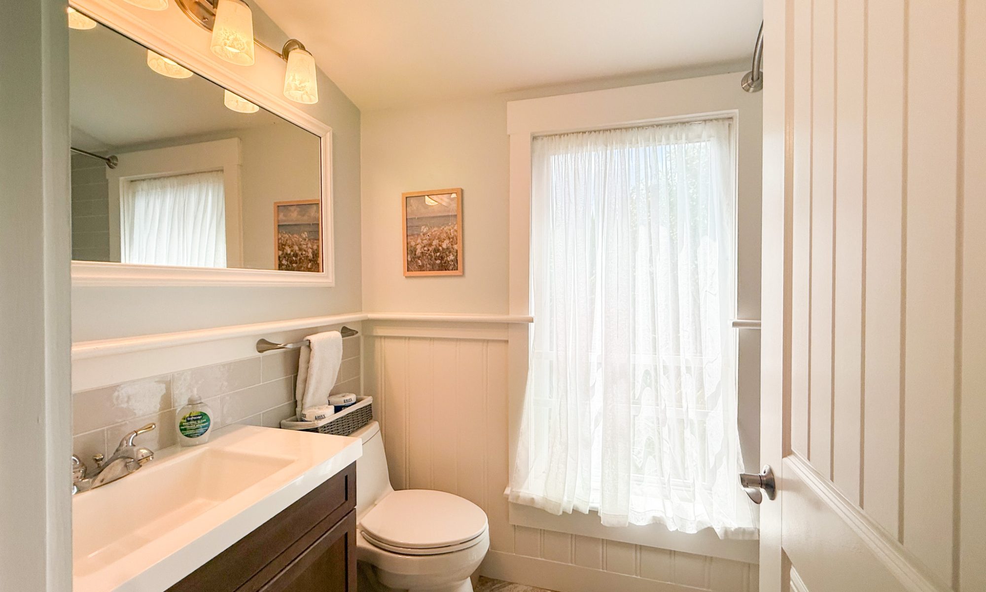 All bathrooms are stocked with towels, hand soap, shampoo, conditioner and body wash. The two kitchens are stocked with dish towels, hand soap, dish soap, paper towels, and scrub sponge.