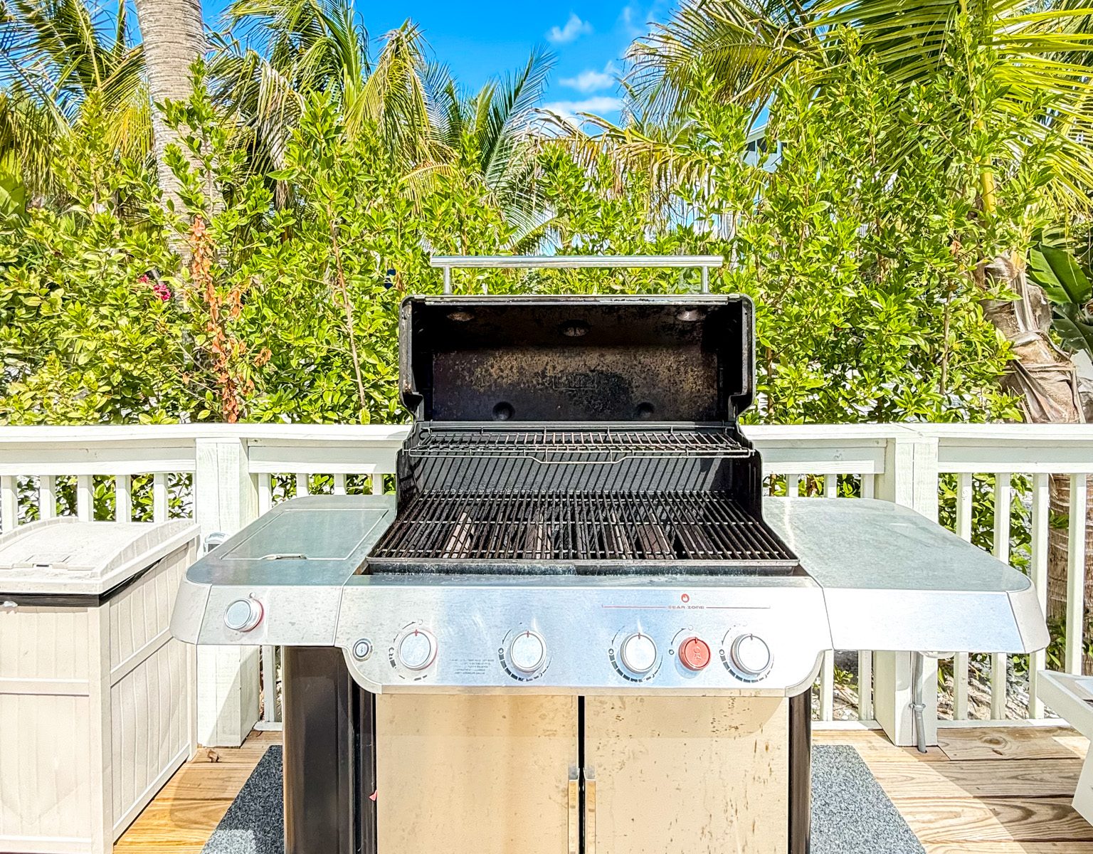 GAS GRILL: Propane provided. The grill is a Weber Genesis S-435 — the 4 burner version so you can fit 28 burgers! Pizza stone is included for grilling.
